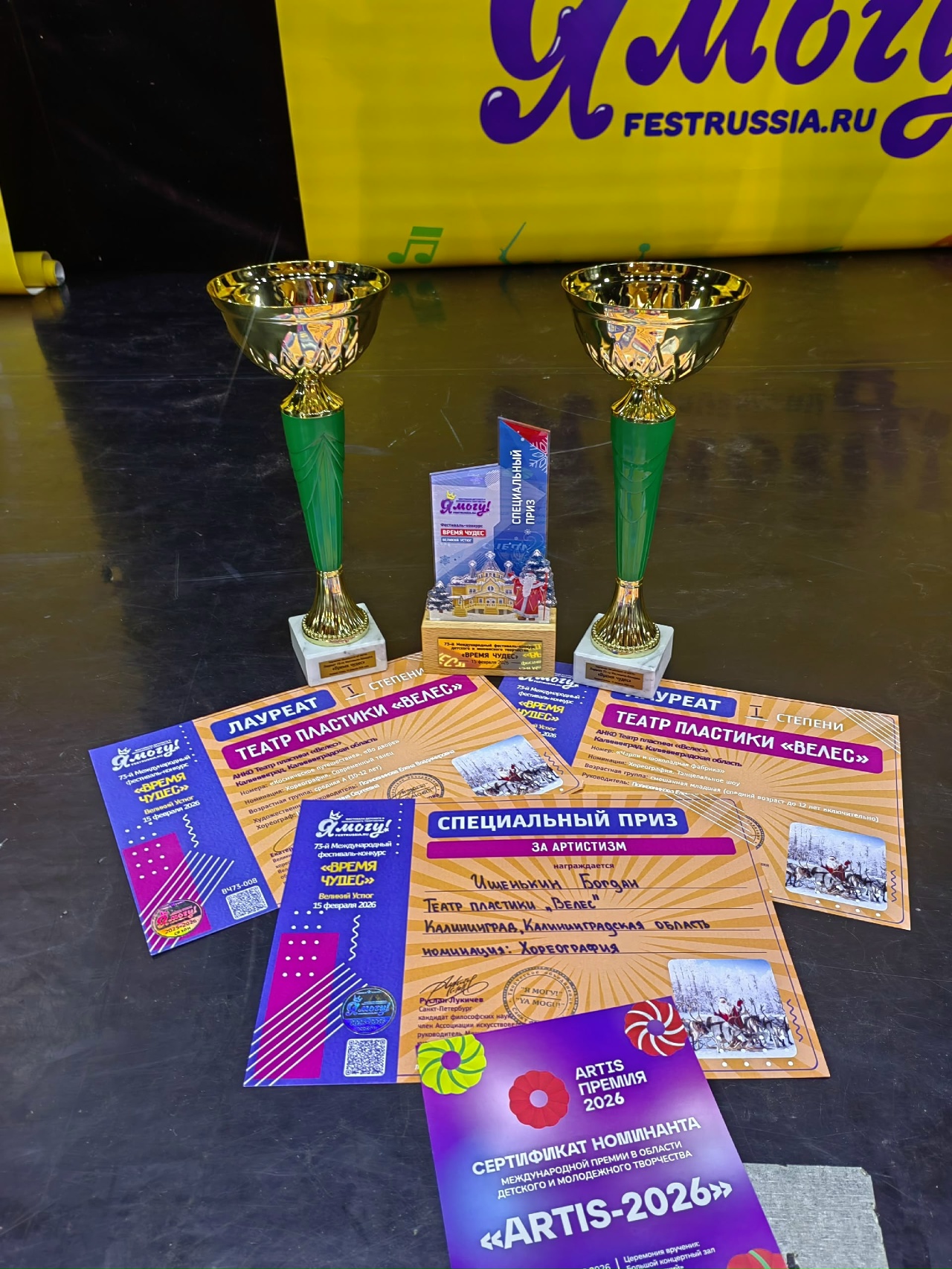 Специальный приз: за Актерское мастерствоИшенькин БогданА так же: Мы стали номинантами Международной премии в областидетского и молодежного творчества "Артист-2026" и приглашены на церемонию вручения в Санкт-Петербург в декабре 2026.